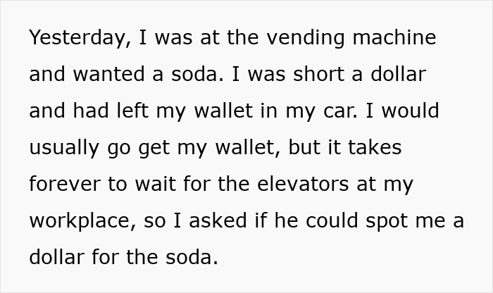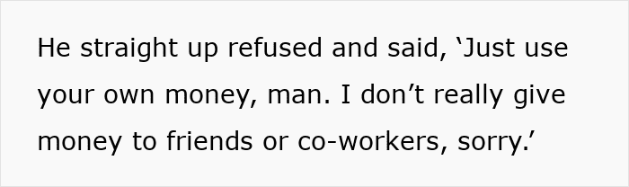 One day, when he was short just a dollar at the office vending machine, he figured his carless co-worker could spot him. Turns out, nope. He flat-out refused and said he doesn’t “give money to friends or co-workers.” Ouch.