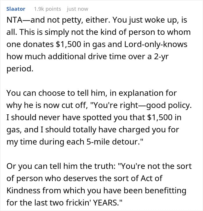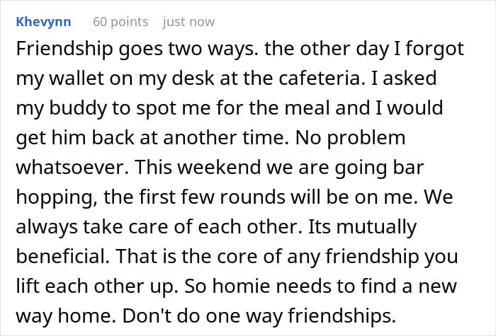 For OP, it wasn’t about the dollar, it was the principle. After all those free rides, the least his co-worker could do was return a tiny favor. But instead of being empathetic, the guy acted like he was being asked for a loan with interest. That moment of pettiness made something click for OP.