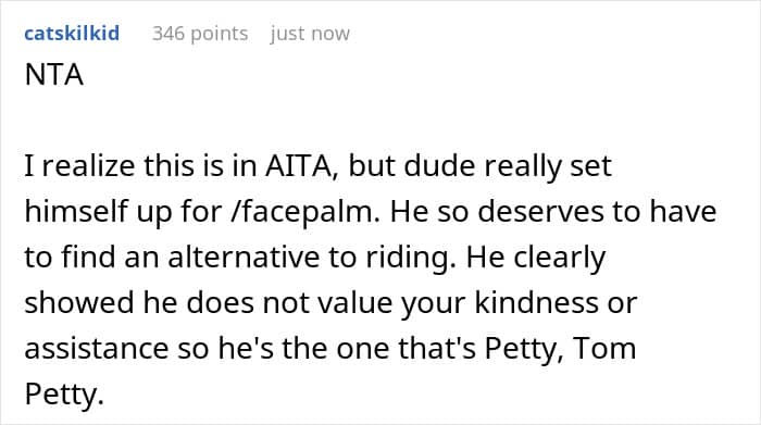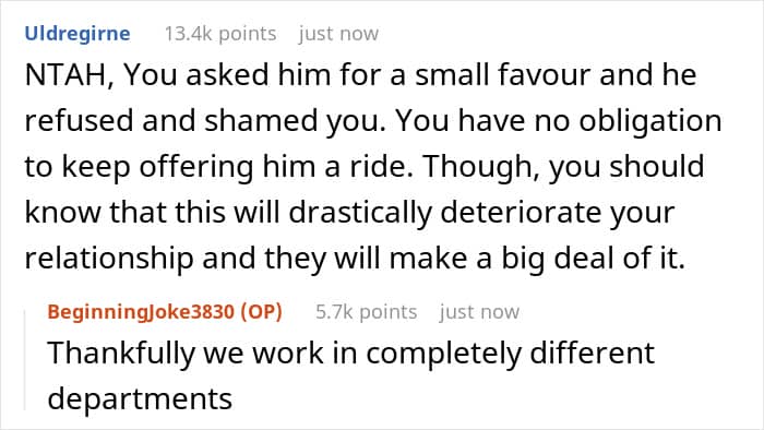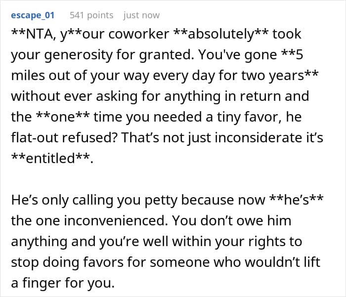 In the comments, readers swiftly concluded that the guy wasn’t a jerk for pulling the free rides favor and slammed his colleague for taking his generosity for granted