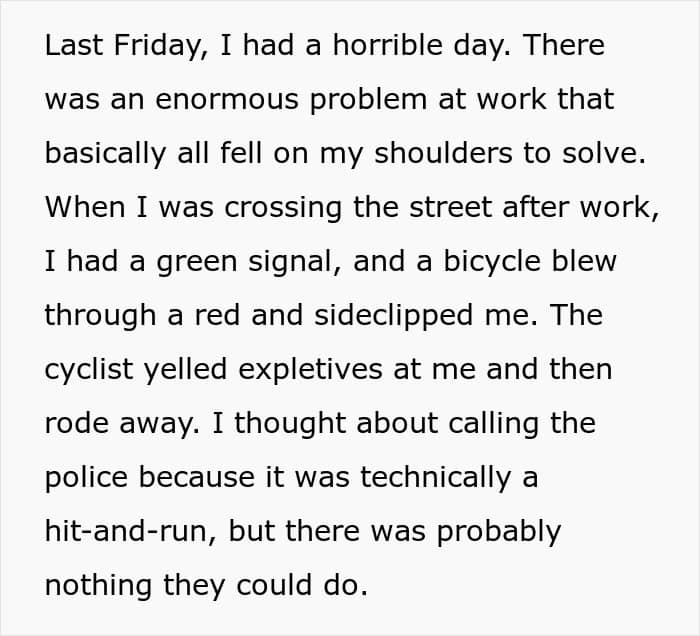 The man was hit by a bike and told his wife about it, but instead of supporting him, she tried to prove she was right about the law