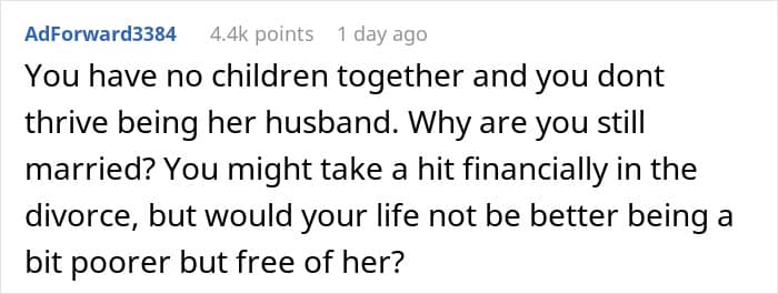 One man, fed up with his wife’s lack of support and constant need to be right, told her his life would be better without her