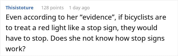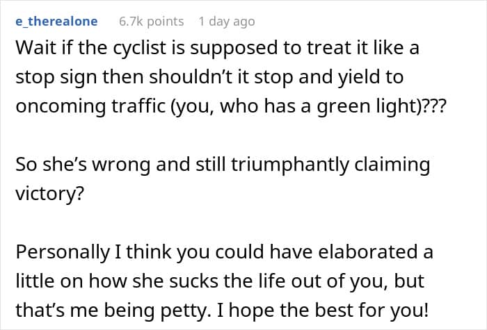 So, our guy went home, desperate for some comfort, and shared the whole ordeal with Anne. Now, at this point, you’d think a loving spouse would say something like “Wow, that’s terrible! Are you okay?” But no. Not Anne. She actually jumped to defend the cyclist. According to her, red lights don’t even apply to bikes. Sure, the guy may have missed a red light, but Anne’s countless red flags can be spotted from the moon.