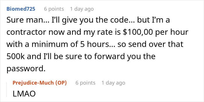 Finally, the boss had no choice but to reach out. They acted as if nothing had happened and asked them to provide the code, which OP refused to give.