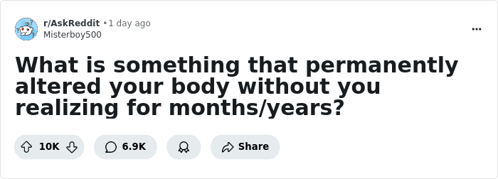 The original thread, which appeared in the AskReddit community 10 days ago, already has 12K upvotes so far, and over 8.5K comments with folks giving their ideas on what permanently alters one’s body without them even realizing. Among the listed factors are both very common ones, like stress, lack of sleep or poor nutrition, and quite unexpected ones – such that we would hardly have suspected them, at least before reading this selection.