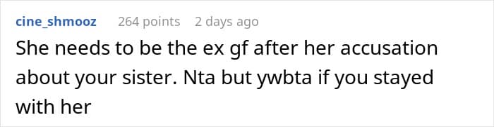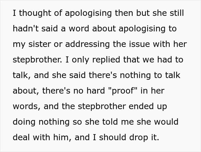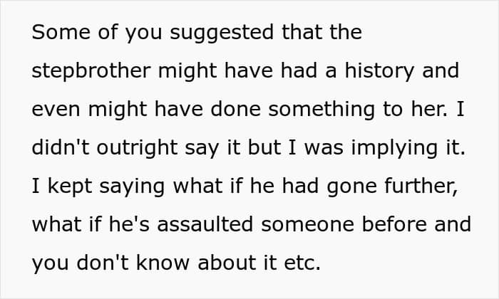The girlfriend in this story tried to downplay the seriousness of the situation by claiming that this wasn’t a big deal. In her eyes, there was no “hard proof” and her stepbrother “ended up doing nothing.” What’s more, she didn’t take her boyfriend’s opinion seriously and tried to deflect the issue and make it about her feelings.