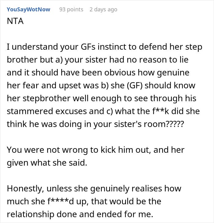 This guy started questioning his girlfriend’s morals after she chose to believe her creepy stepbrother over his 15-year-old sister. The woman saw nothing wrong with the sleazeball coming into the teen’s room to “chat her up.” But her brother was having none of it and prioritized his sister’s well-being and safety.