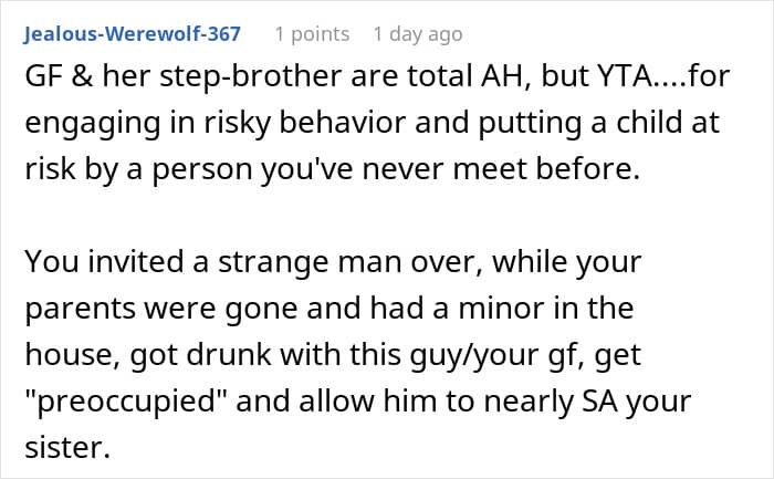 Some people even thought the OP didn’t do enough and was acting irresponsibly by getting drunk while a minor was in the house