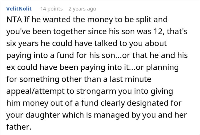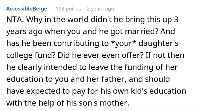 Now, folks, this is where the problem starts, as one day, her husband mentioned that she should give half of that education fund to his son as he needs it now, while the woman’s daughter still has a few years. Of course, our poster refused and clarified that she had been saving the money longer than they had even been together, and her daughter is aware that the money is for her and nobody else is entitled to it.