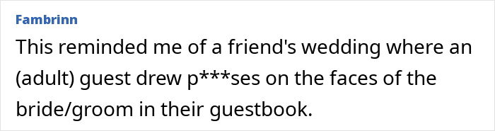 Unfortunately, Reddit user Mani_San had a child-friendly wedding but now highly regrets it. The couple had a unique puzzle-piece guest book, which they wanted to mount on their wall later, but the kids completely ruined it by signing and writing on it. Devastated, the bride vowed never to have a kid-friendly event ever again!