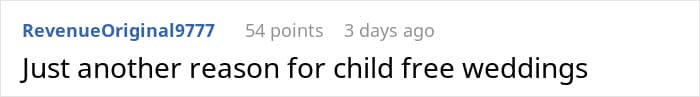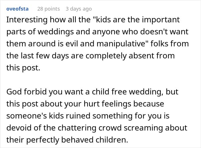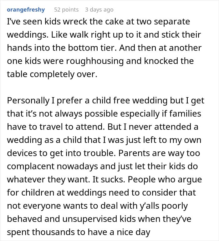 A study by The New York Times found that 79.5% of 4,000 couples with 2024 wedding dates favored kid-free weddings. Our poster’s disastrous experience is a big giveaway as to why so many people prefer to have child-free weddings these days. After all, the environment is unfamiliar for kids, and when there are quite a few of them together, chaos is quite imminent.