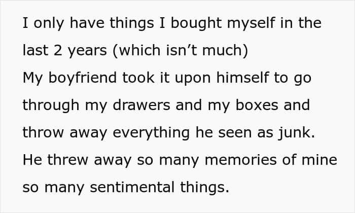 Moving in together should be about teamwork, but one woman was blindsided when her boyfriend took it upon himself to “declutter” their shared space—by throwing away her most cherished belongings.