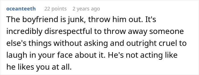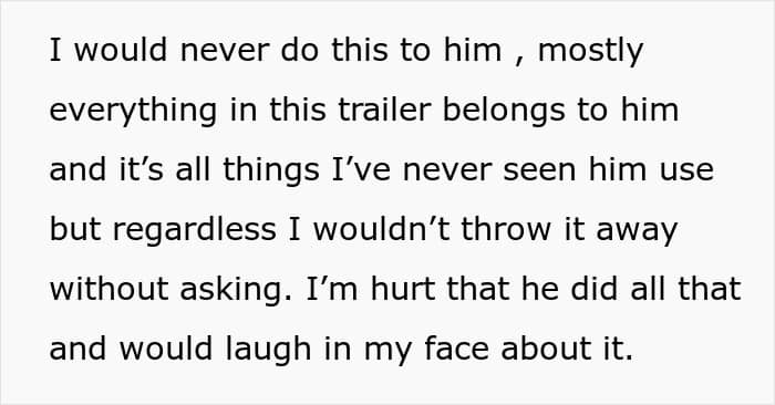 Well, OP couldn’t believe the blatant disrespect. Everything in the trailer was essentially his, yet she would never dream of trashing his stuff. But he had zero remorse, seeing no problem with discarding her memories like garbage. The sheer lack of empathy cut deep, making OP question not just his disrespectful actions—but the relationship itself.