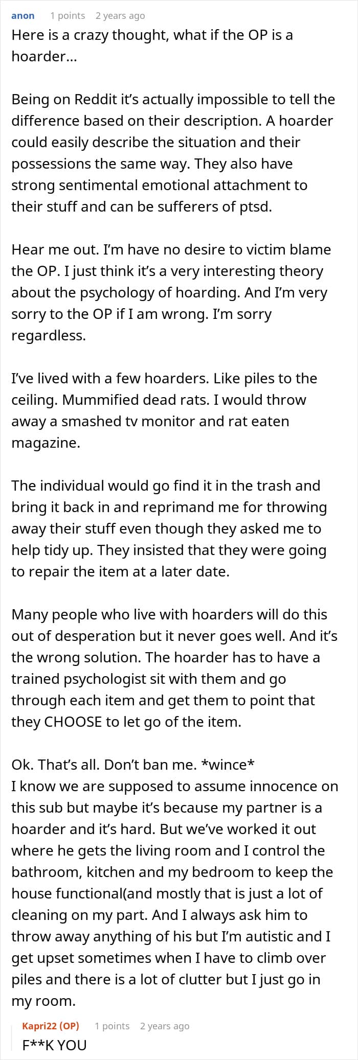 When she confronted him about it, he laughed in her face and accused her of being a child and a hoarder