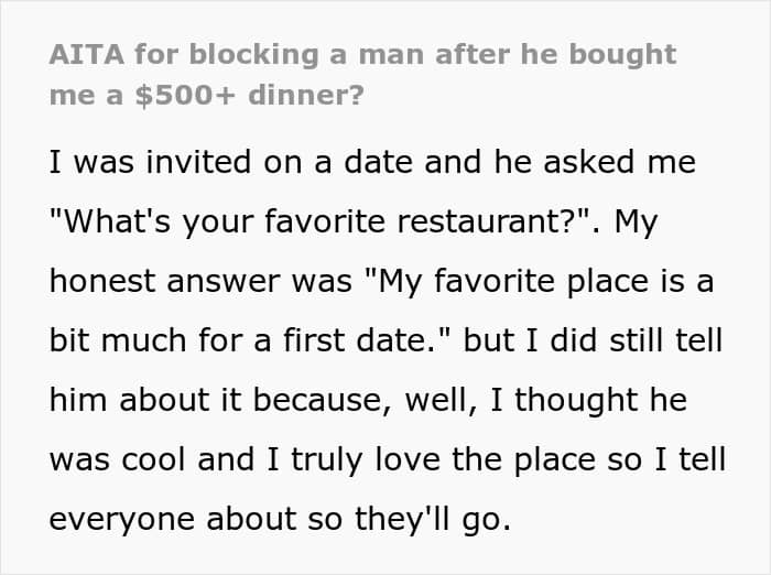Sometimes, when going on a date, people focus on another person more than usual, attempting to judge their character or understand their intentions. While on the one hand, such attempts might result in reading into things that aren’t really there, and therefore simply focusing on having a good time might often be a better strategy, on the other hand, from time to time, without trying very hard, one might encounter a certain deal-breaker in their partner that, trusting their gut feeling, they judge intolerable. Despite there always being a chance of misunderstanding, they may decide to part ways or even go as far as to block the other person, as this Redditor did after getting “tested” during a first date at her favorite restaurant.