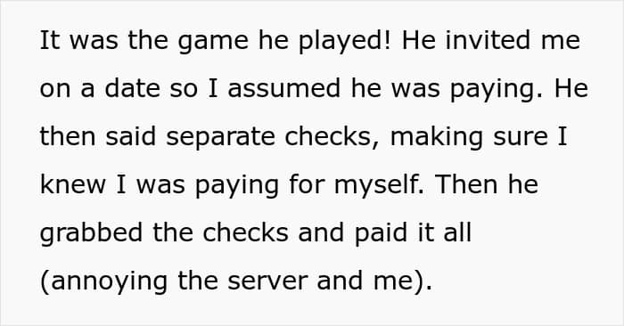 As her date invited her and she did assume he was paying, then the man made sure she knew that she should pay for herself, while eventually grabbing the checks and paying it all by himself – annoying the server and his date.