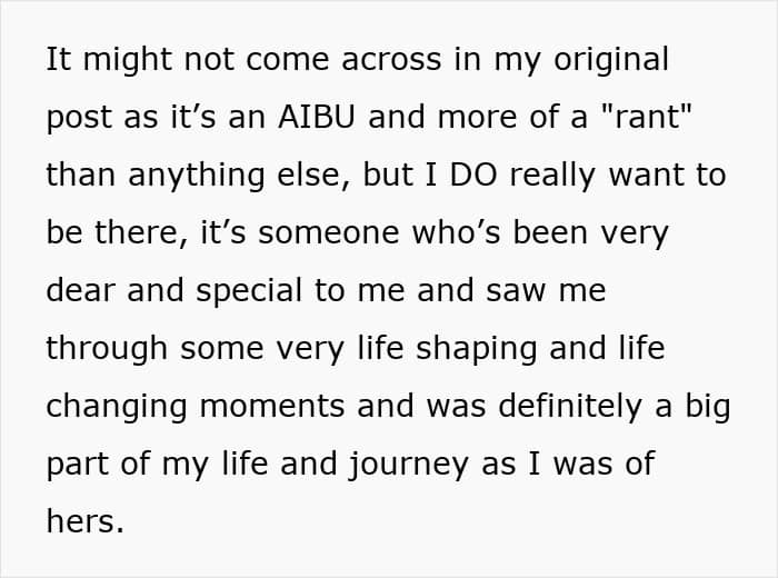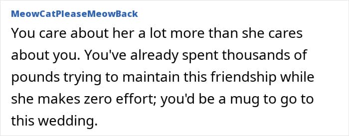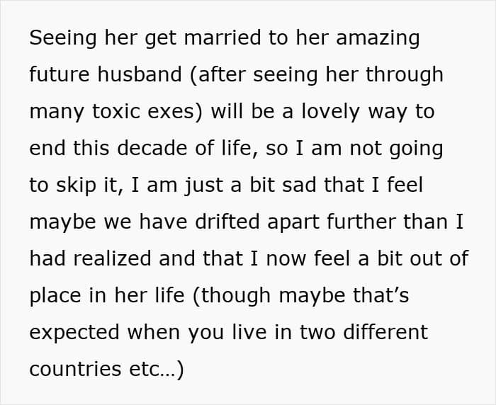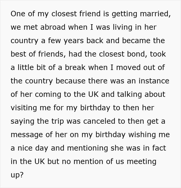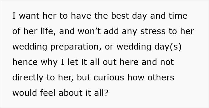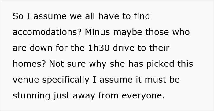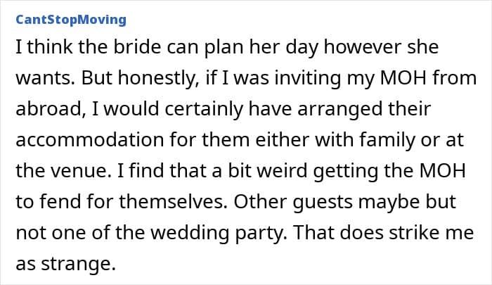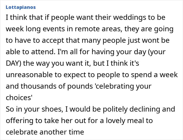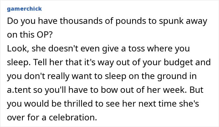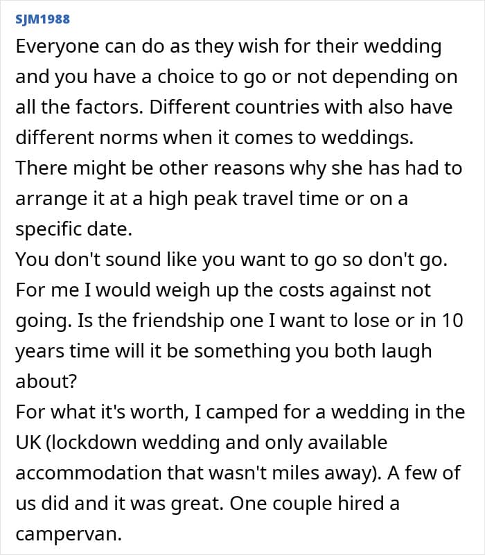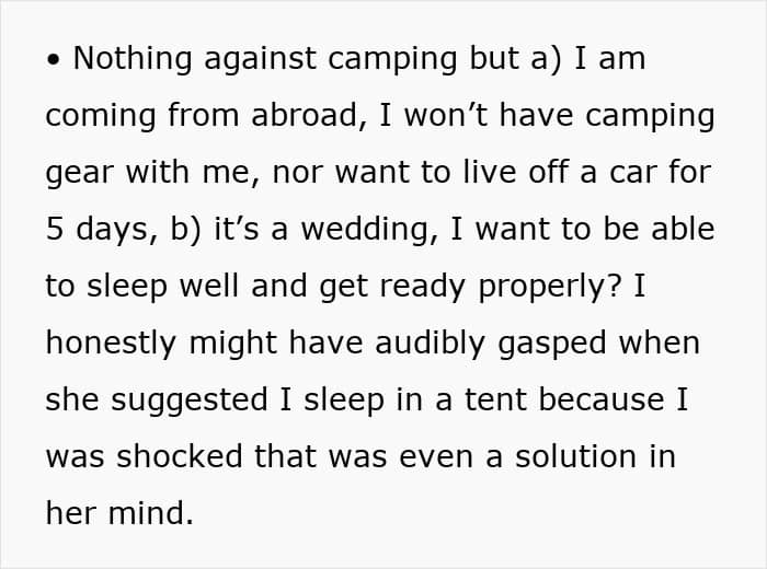 Unfortunately, this bride, who planned an extravagant long-week wedding, didn’t think about her invitees, especially her maid of honor. On top of travel and rental car costs to get to a remote location, she was offered to sleep in a tent, which prompted her to turn to people online and ask if her best friend’s wedding planning was a bit off the rails.