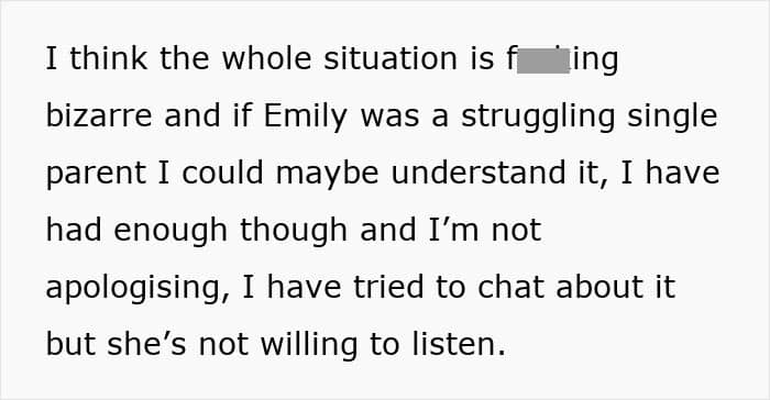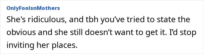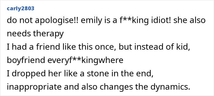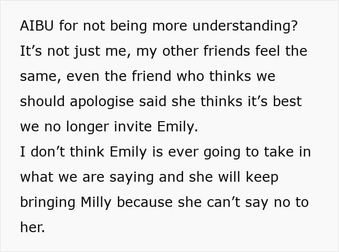 What makes this especially frustrating is that it often puts both the child and everyone else in an uncomfortable situation. Kids get bored, restless, or overwhelmed in settings that are not designed for them, leading to behavior that parents then struggle to control. At the same time, other guests are forced to either endure the disruption or risk being seen as rude if they express frustration. It creates a situation where no one is truly happy, all because Emily refuses to acknowledge that not every space needs to be a family-friendly one.