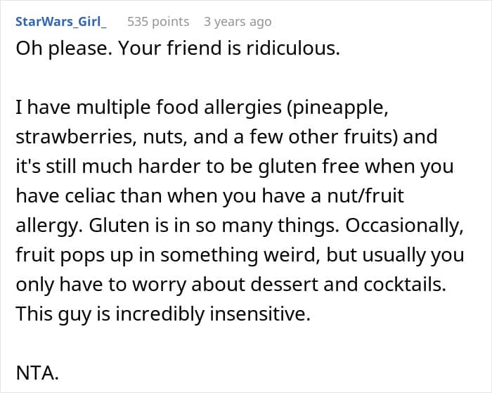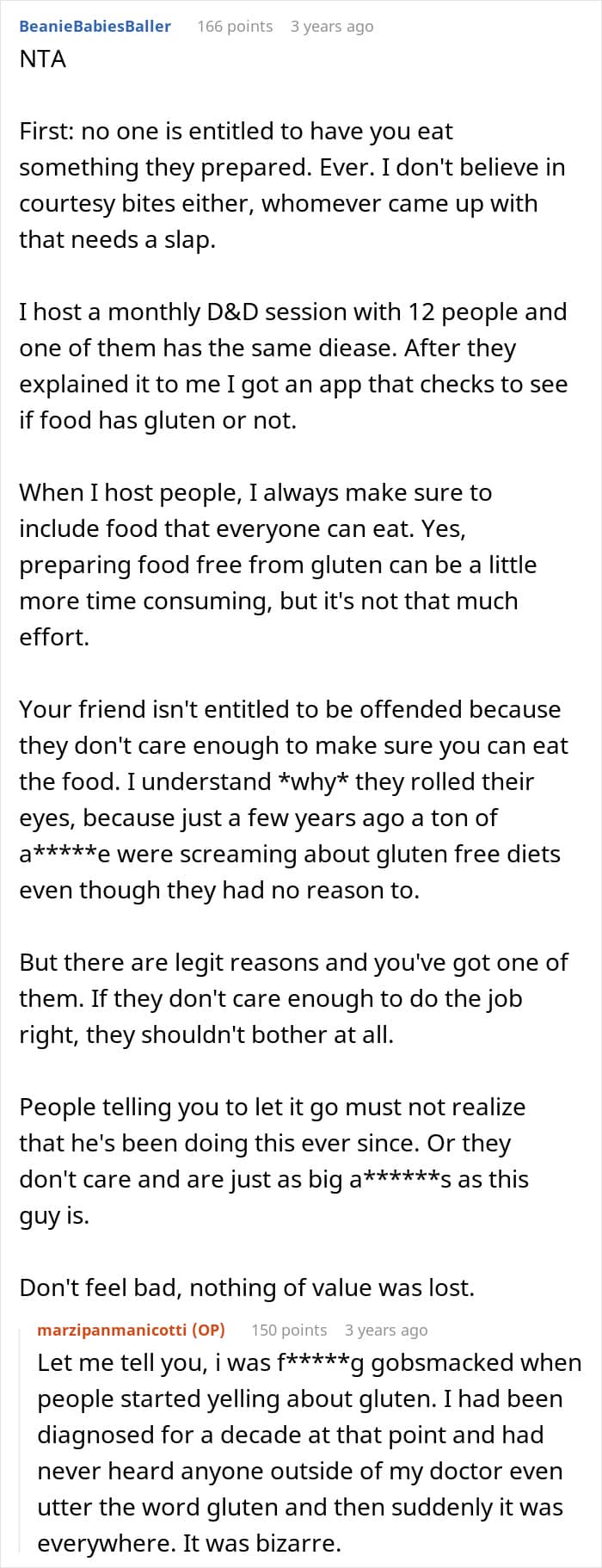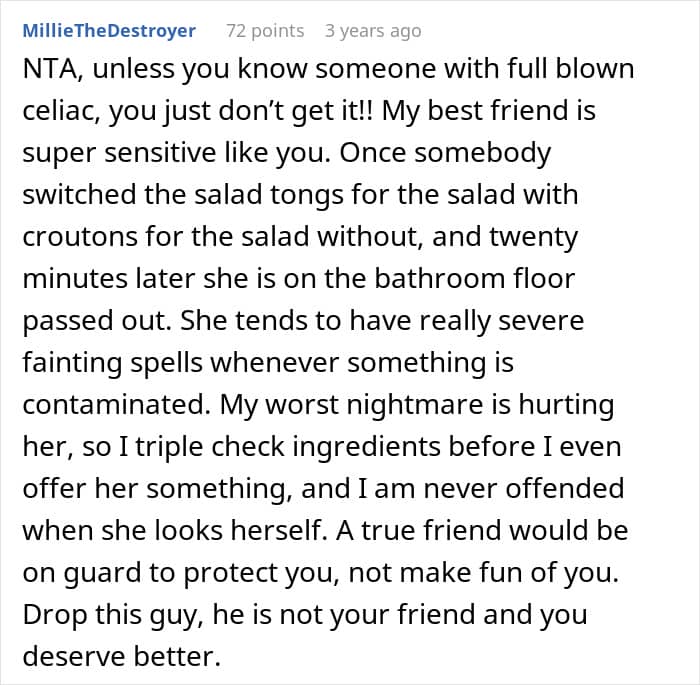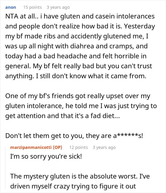 So one woman was very frustrated when her so-called friend got annoyed that she realized the dish he cooked wasn’t gluten free
