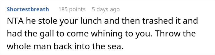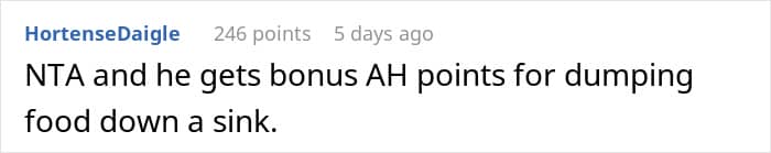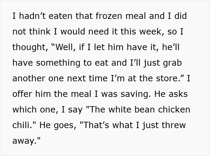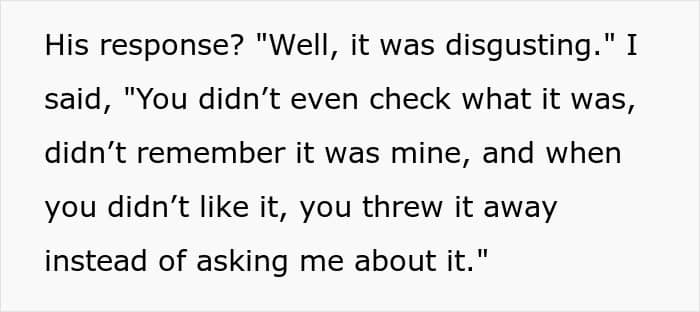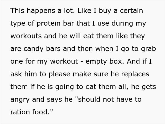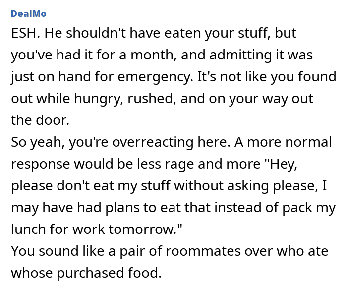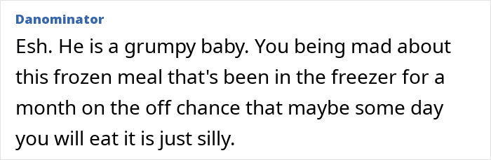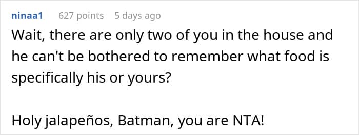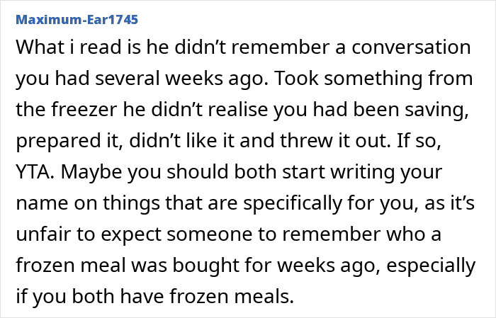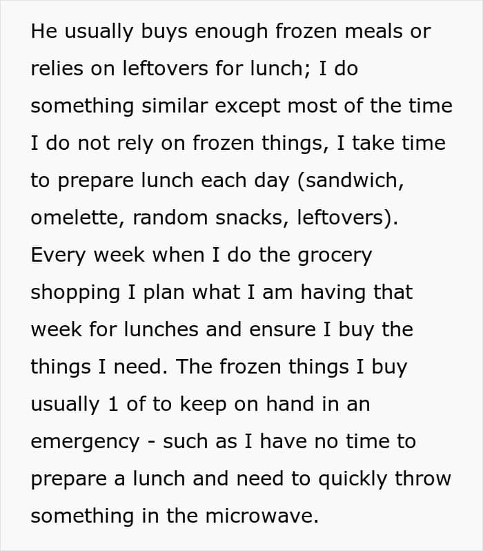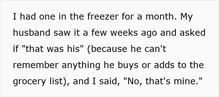 No_Sherbert_7460 also found it interesting how many commenters couldn’t understand why a married couple might have separate food. “Here’s the deal – we do not like the same things. And, I know there are certain things that he really enjoys, and I could take them or leave them,” the author explained. “Knowing that he really enjoys that one flavor of ice cream, and I am ‘meh’ about means I won’t touch it since I knew he bought it for himself. If I really want it, I ask first. That is just courtesy. I wouldn’t take his car without asking first, why would I assume anything different with his food?”