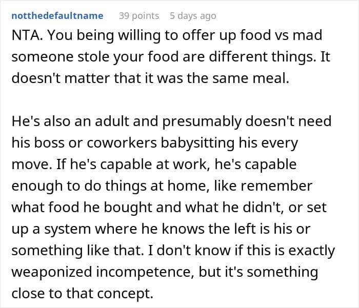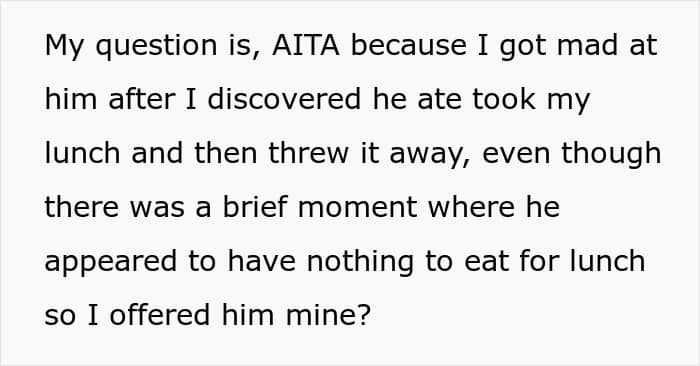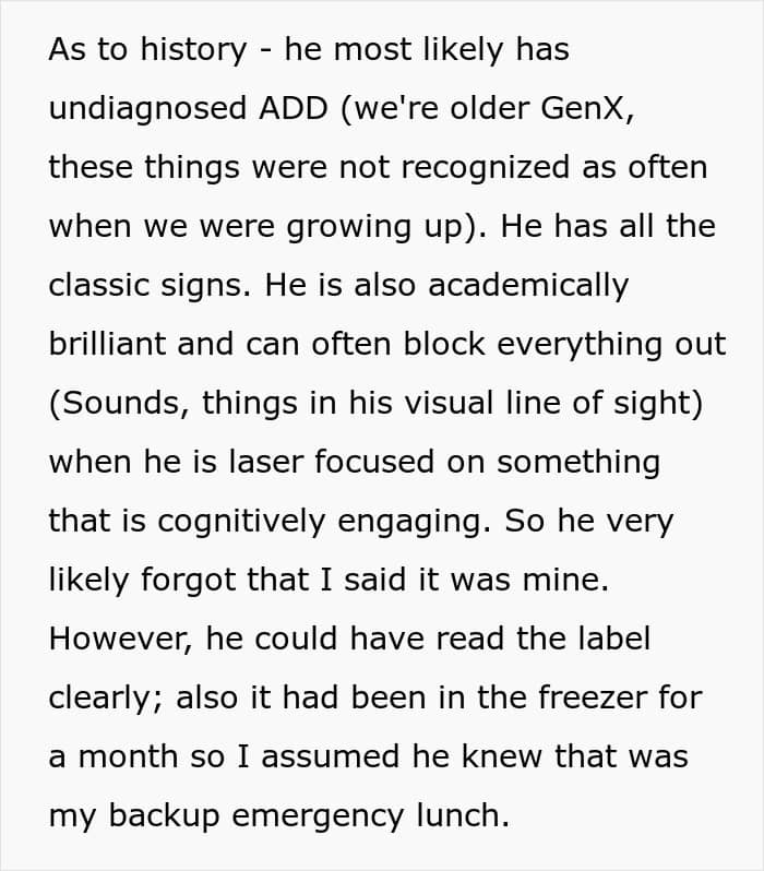 We also asked No_Sherbert_7460 if her husband understood how upset taking her food made her prior to this incident. “I don’t think he did; I also think that he and I perceive things very differently, and that will likely always be an issue,” the author shared. “So knowing how the other person sees something helps you understand why they are reacting.”