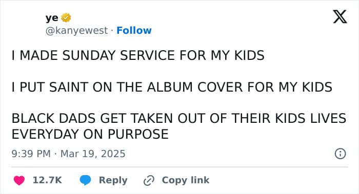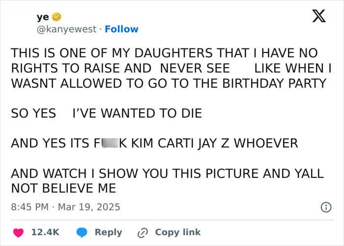 He accompanied the post with a photo of his and Kim’s 7-year-old daughter, Chicago. Ye alleged that he had “no right” to raise Chicago and was not allowed to see her.