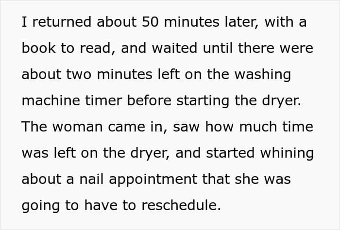 When asked reasonably what was going on, the woman said that she was in a hurry because she had a nail appointment soon, and when she arrived, the previous wash was already finished and she couldn’t wait. Well, at this point, the OP came up with a completely unmatched plan for petty revenge in their head, especially when they realized that the woman didn’t even know who they were.