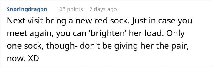 Well, the commenters were in awe of this. “Sounds like you showed her exactly why it’s important to be considerate of others, and I love it,” someone wrote in the comments. And another person even suggested that the author go further, in the event of a possible new meeting with this neighbor, by simply throwing a single red sock into her basket… “You can ‘brighten’ her load,” the commenter added sarcastically.