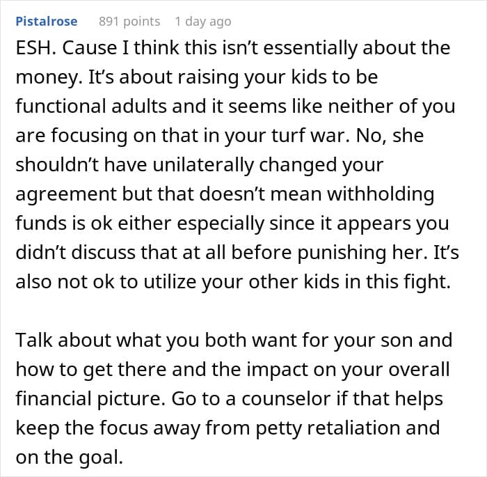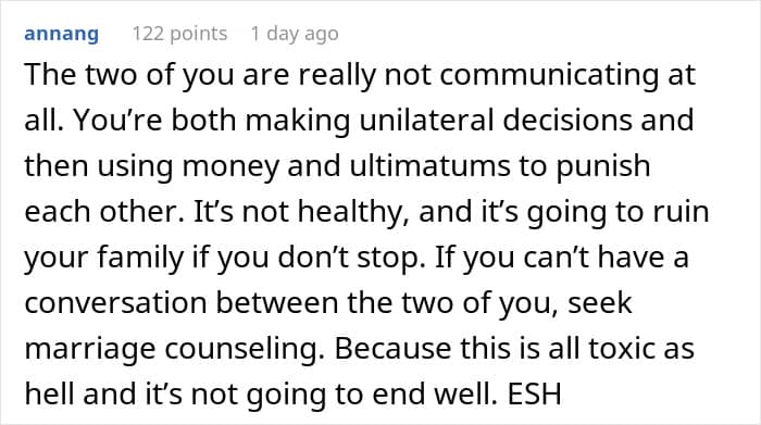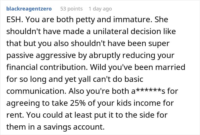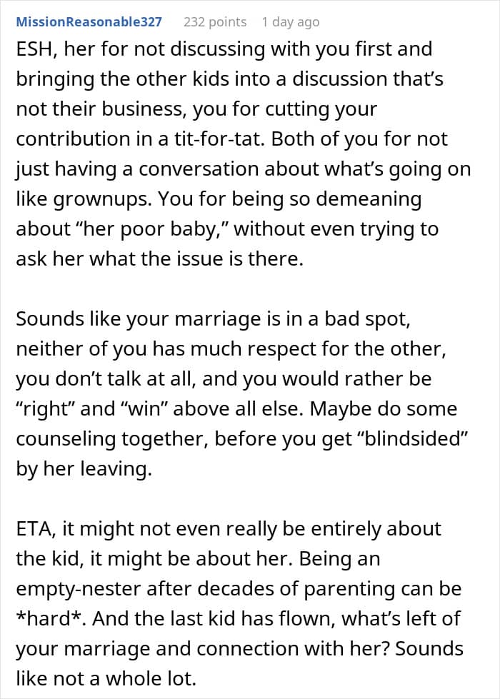 However, there are a few other issues in this story. The person who shared it does say that their wife did most of the childcare. Most likely they didn’t ask them for advice every single time since 1998, so perhaps she just decided that this was her call to make. Similarly, cutting one’s contributions is pretty petty, when this is actually a good opportunity to discuss what to do. Money is often a touchy subject, which is why it has to be treated with respect.