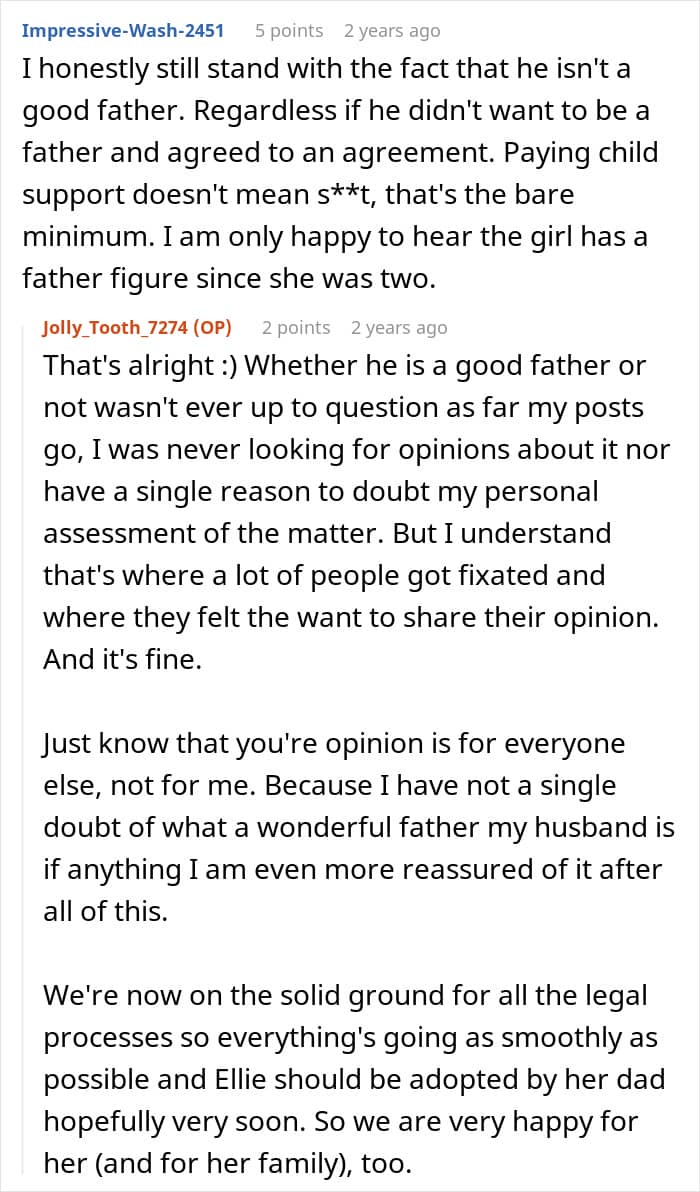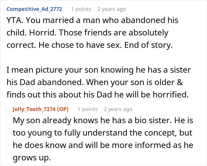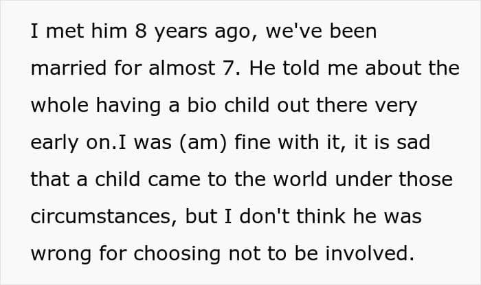 Redditor Jolly_Tooth_7274’s husband made a conscious decision to completely cut ties with his biological daughter before meeting her. The current wife is aware of the whole situation, and he supports the child financially. But he has never seen her, nor does he plan to. Now the couple has a son together, and she believes that her husband’s past doesn’t interfere with him being a good father, which some of their friends found to be absurd.