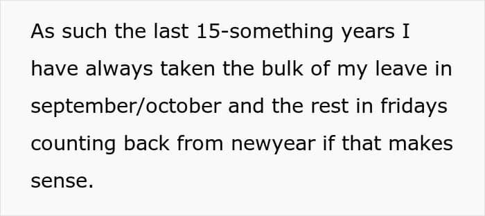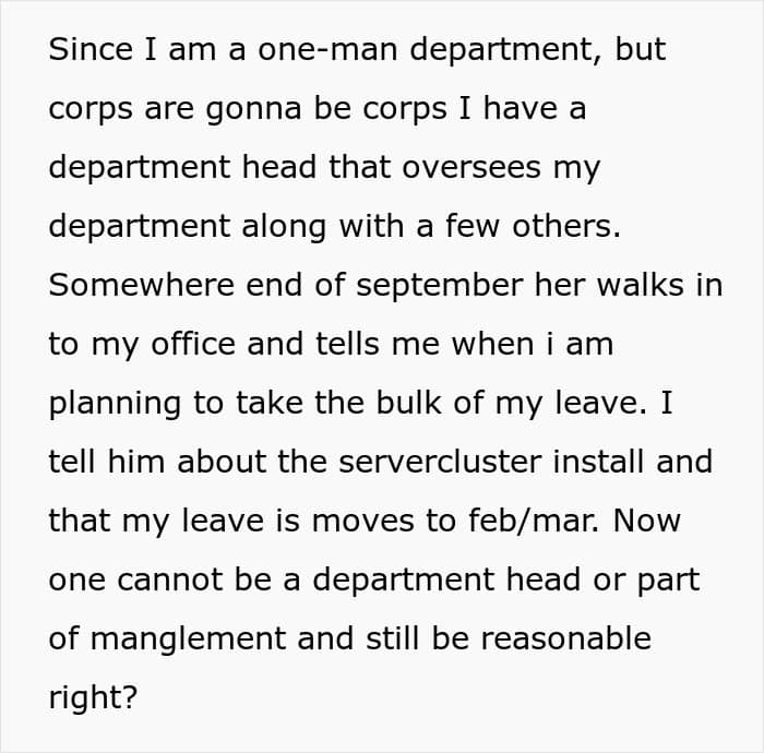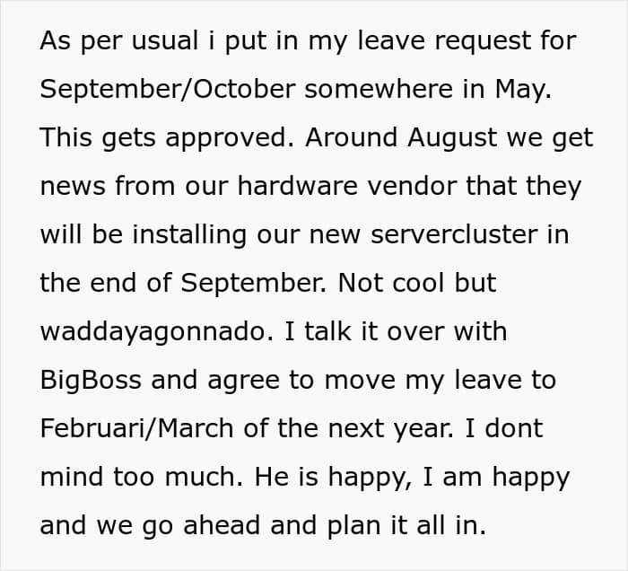 The story goes that OP has been the IT guy at this one company for over two decades now. And being a veteran of this particular company means a number of things, including a sweet boost to the total annual vacation time. OP has always been a team player, working overtime, adjusting to circumstances and taking time off during the company’s version of off season.