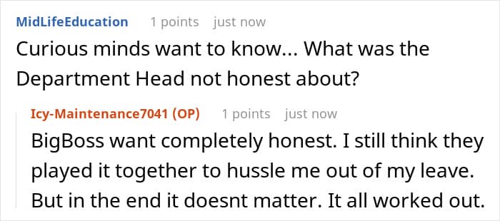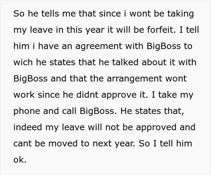 Long story short, some time later OP found out that the whole vacation deal he had worked out with his boss wasn’t actually approved. And a quick double-check with the appropriate parties confirmed this. So OP was now essentially looking forward to nothing when it was supposed to be his time off. The boss-people hadn’t honored the agreement.