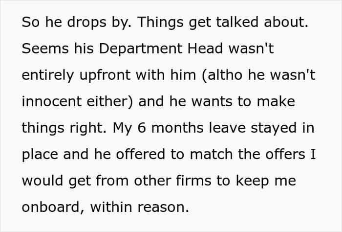 It started off with the fact that OP still had his 6 months of leave approved and he also got a 15% pay rise to compete with what the other companies’ offers. Besides that, no more overtime, no more mandatory computer and phone at home, and vacation time preferences are now in the hands of OP. Not too shabby, right?