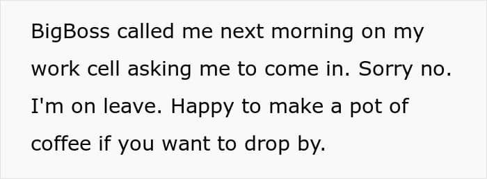 The next morning, OP gets a call. It’s the boss. Asks him to come in, but no can do, vacation time is sacred, you see. But, hey, a lovely chat over some coffee at OP’s place is an option. It’s on. The two talk it out, turns out corporate bullpies were afoot and the boss wanted to make things right. How right? Well…