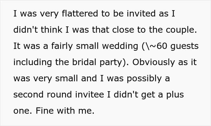 So, according to the MOH, the original poster didn’t act very appropriately towards the other guests who also weren’t allowed a plus one. As a result, as she stated, everyone ‘felt bad’ because her boyfriend had to wait outside for the wedding to end…
