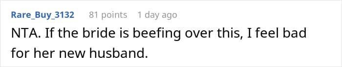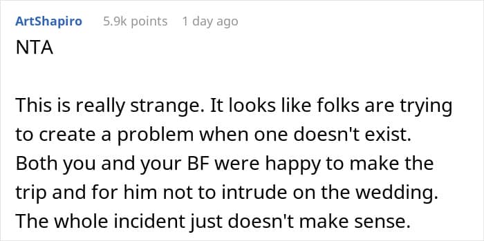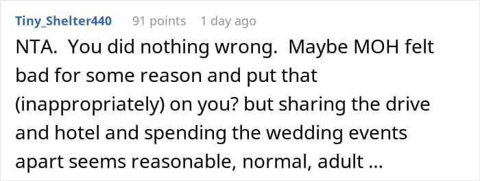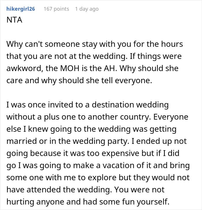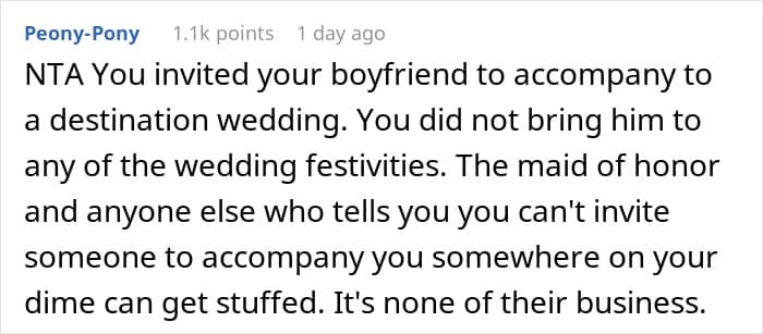 People in the comments were also surprised by such a reaction from the MOH, claiming that she is essentially inflating a non-existent problem. “This is really strange. It looks like folks are trying to create a problem when one doesn’t exist. Both you and your BF were happy to make the trip and for him not to intrude on the wedding. The whole incident just doesn’t make sense,” one of the responders wrote.
