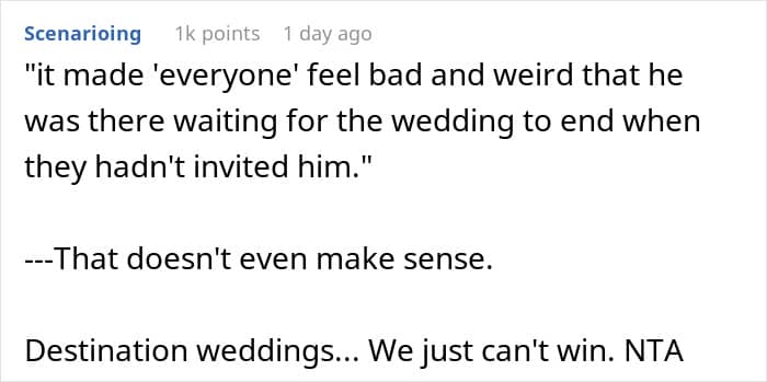 For example, here’s a story from the user u/No_Ganache_2548, who was unexpectedly accused of being awkward and unreasonable by the maid of honor after attending a destination wedding – even though the guest herself hadn’t broken any rules, according to her own words. Anyway, let’s figure it out together.
