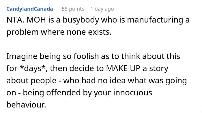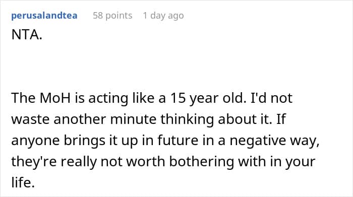 In any case, according to many commenters, the only one who was being unreasonable here was the maid of honor herself. “The only person making it awkward and uncomfortable is the MoH,” someone replied. “The MOH is a busybody who needs to get a life,” another commenter added. And what do you, our dear readers, think about this case?
