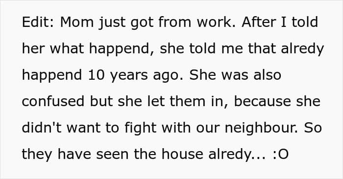While it’s understandable that the previous owners might want to see what their house looks like now, forcing themselves inside is certainly not it. What’s more interesting is the role of the neighbor in this situation. u/No-Ask3051 says that their relationship prior to this incident was quite neighborly.
