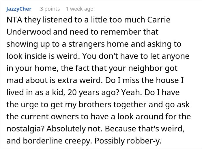 The Redditor says she was a tad shocked when the neighbor reacted in such a hostile manner. “She was quite angry when I denied their request. I have never seen her like that. She tried to get answers [about] why I am not comfortable with letting strangers in my home. I said, ‘I am not comfortable and that is it for me.’ She told me I was rude.”