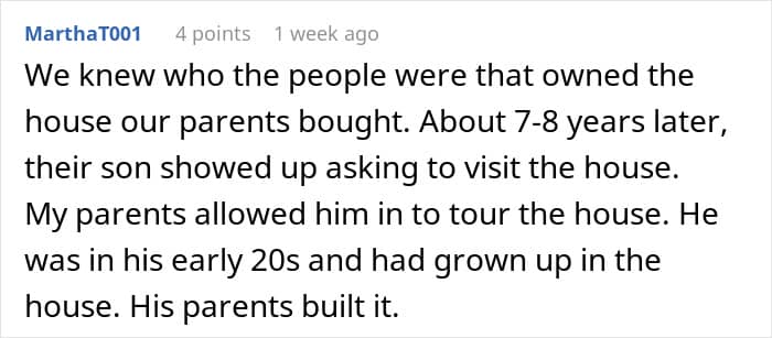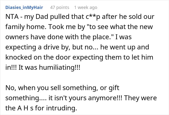 This person had to deal with the previous owners of their house. Recently, she came to Reddit to tell the story of how two women who grew up in that house asked to be let in and see what it looks like now. Perhaps the author felt similarly to the way I do because she refused to let them in. After being branded as “mean,” she decided to ask people online: who was right in this situation?
