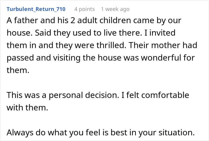 “I posted on Reddit because [the] reaction from my neighbor surprised me and made me feel like an a**. So mixed emotions and thoughts led me to Reddit. And as far as I have seen, 98% of Redditors agreed with me. It is creepy and weird, especially after I found out they were here before.”