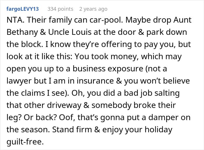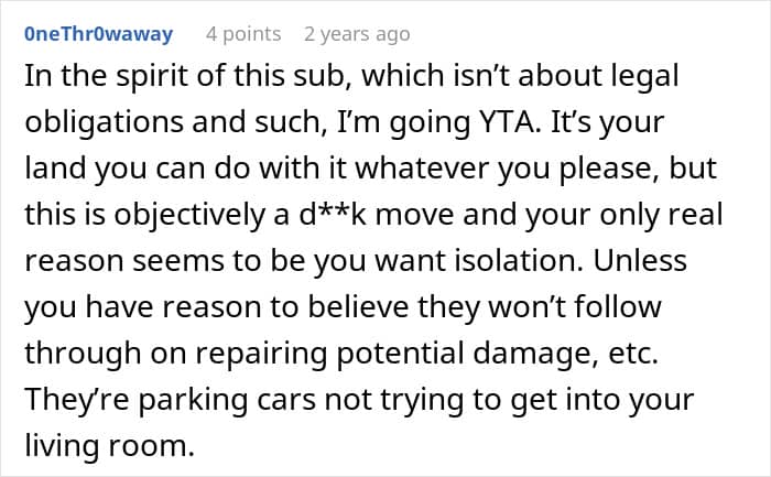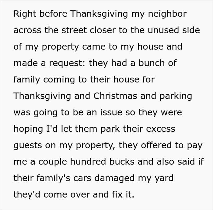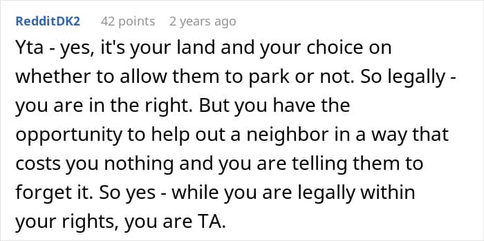 They also want someone who’s friendly and chatty, and—almost nearly as importantly—they want someone who respects an individual’s parking space. The neighbors in the redditor’s story were clearly respectful enough to ask their fellow resident to let them use their property for parking; they even offered to pay for it and fix any damages, were their cars to cause any. But their arguments couldn’t make the redditor change their stance, which redditors seemed to have different opinions on.