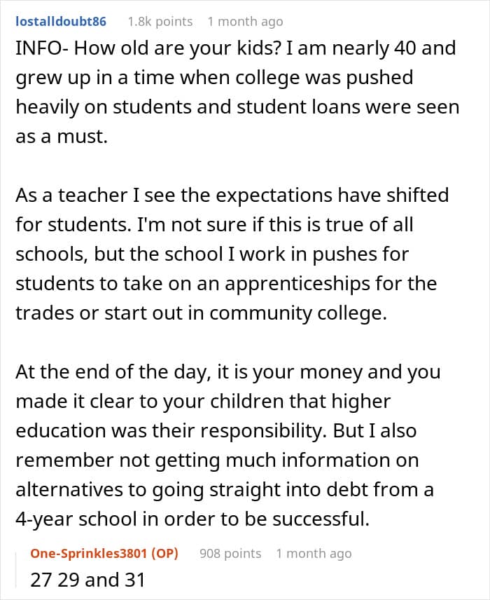 So, the Original Poster (OP) and his wife have three adult children, 27, 29 and 31 years old respectively. All three of them went to college and successfully graduated – albeit at the cost of serious debt. The thing is that, according to the author, the children chose quite prestigious educational institutions – and only his youngest took some community college classes in order to save money.