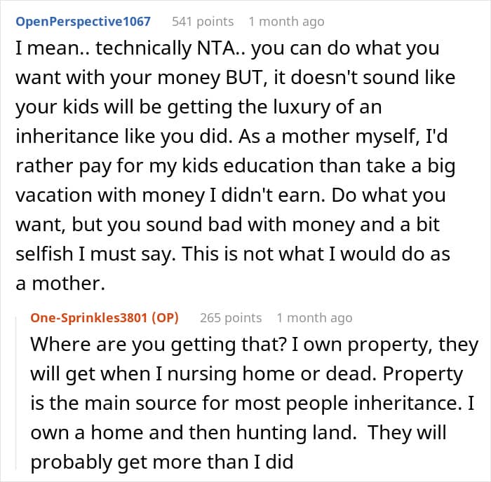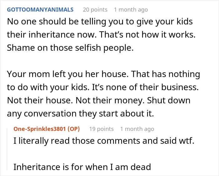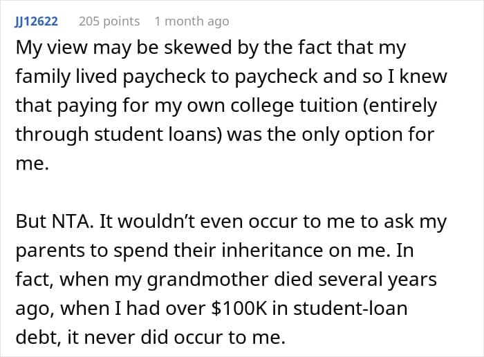 As for commenters on the original post, most people here are inclined to believe that since it was the author who was named in the will and not his children, then so be it. “If your mother wanted them to have money, she would have put it in her will,” one of the responders wrote. “They are adults. You provided for them when they were children, but they chose to attend their schools and accepted that it would put them in debt.”