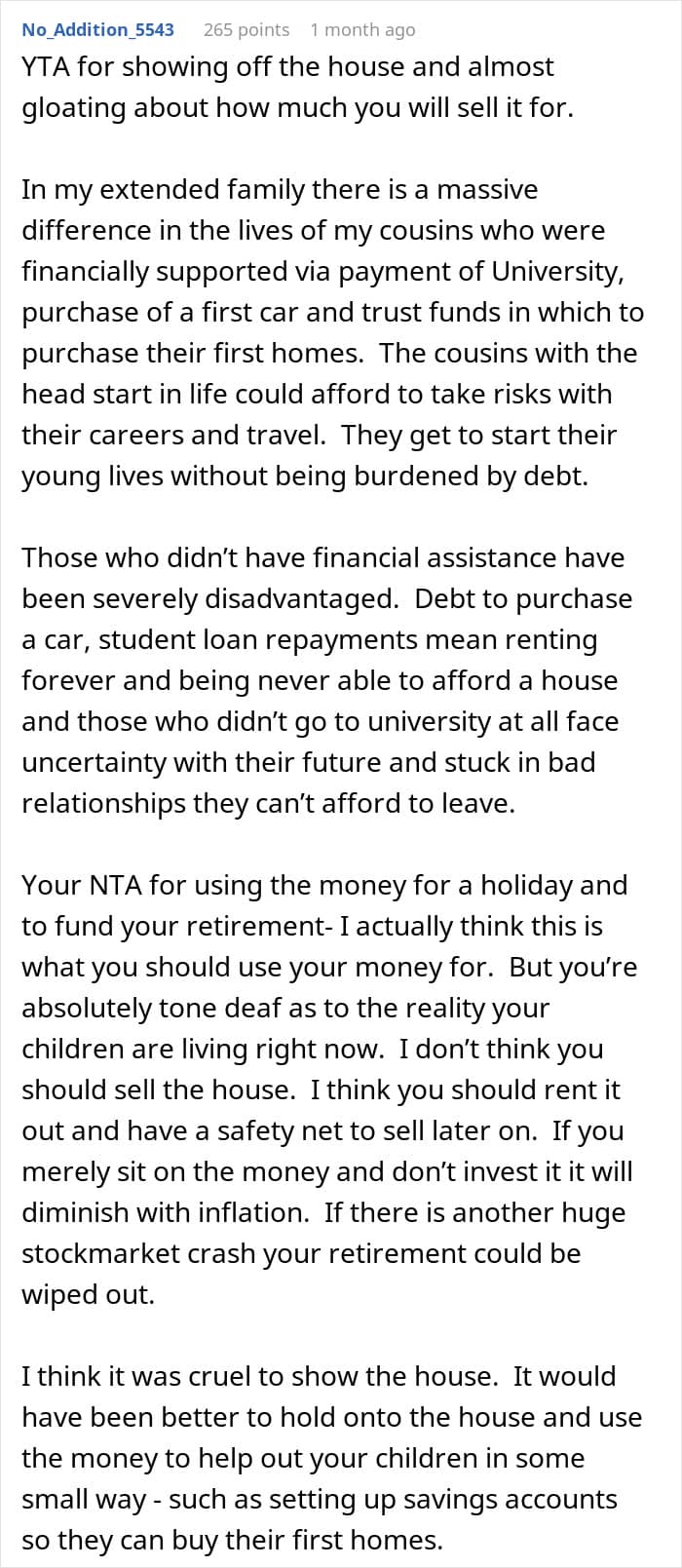 Before telling the children about his plan, the father invited them to look at the house – and this, quite possibly, became a strategic mistake. After that, the kids criticized their dad for being ‘selfish’ and for his unwillingness to help them pay off their college debts. In turn, the father understood perfectly well that he could do this – but then it would take away almost 3/4th of the inheritance.