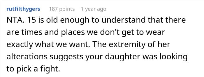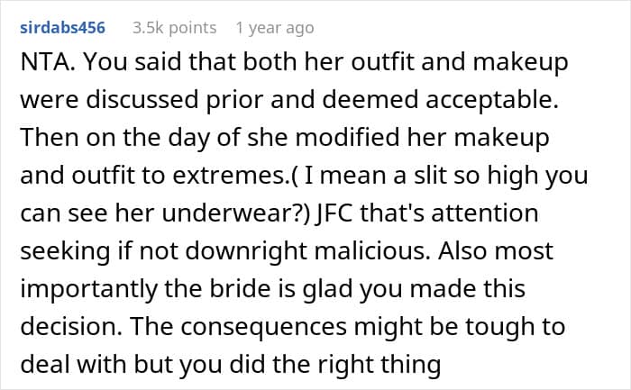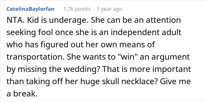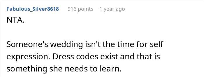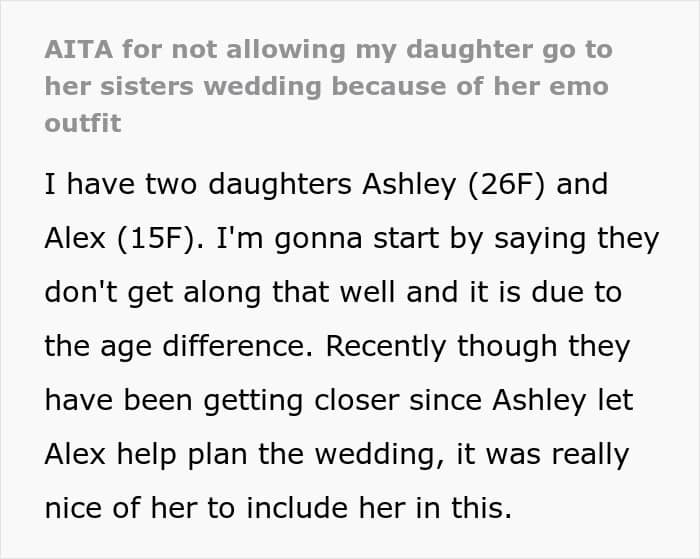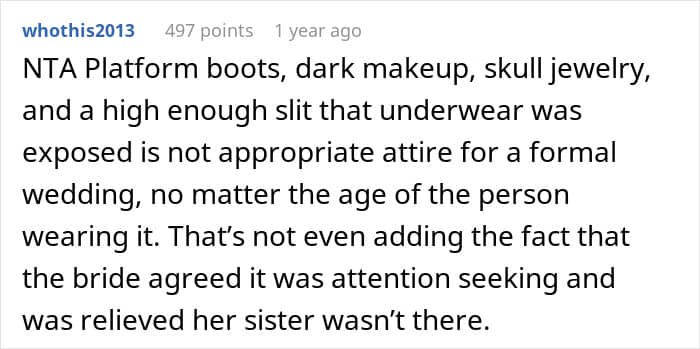 RELATED:Teen wants to wear a dress showing her underwear and goth jewelry and makeup to sister’s wedding, mom tells her to stay home if she plans on dressing like that