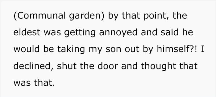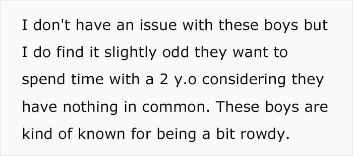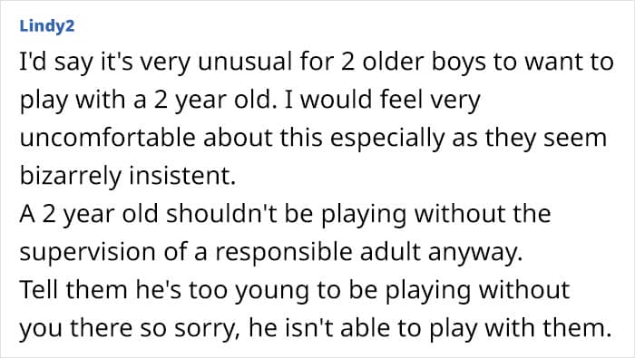 One mother, however, recently shared on MumsNet that she was confused as to why her neighbors that are much older than her son insist on playing with him. She wanted to know if she was being unreasonable for refusing to let the neighbor boys take her two-year-old out, so below, you can read the full story and decide what you think. Let us know in the comments how you would have responded in this situation, and then if you’re interested in another We article featuring neighbor drama, check out this story next.