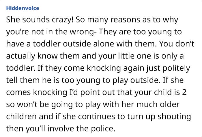 RELATED:This mom reached out online to see if she was being unreasonable for refusing to let her new neighbor’s sons play with her two-year-old