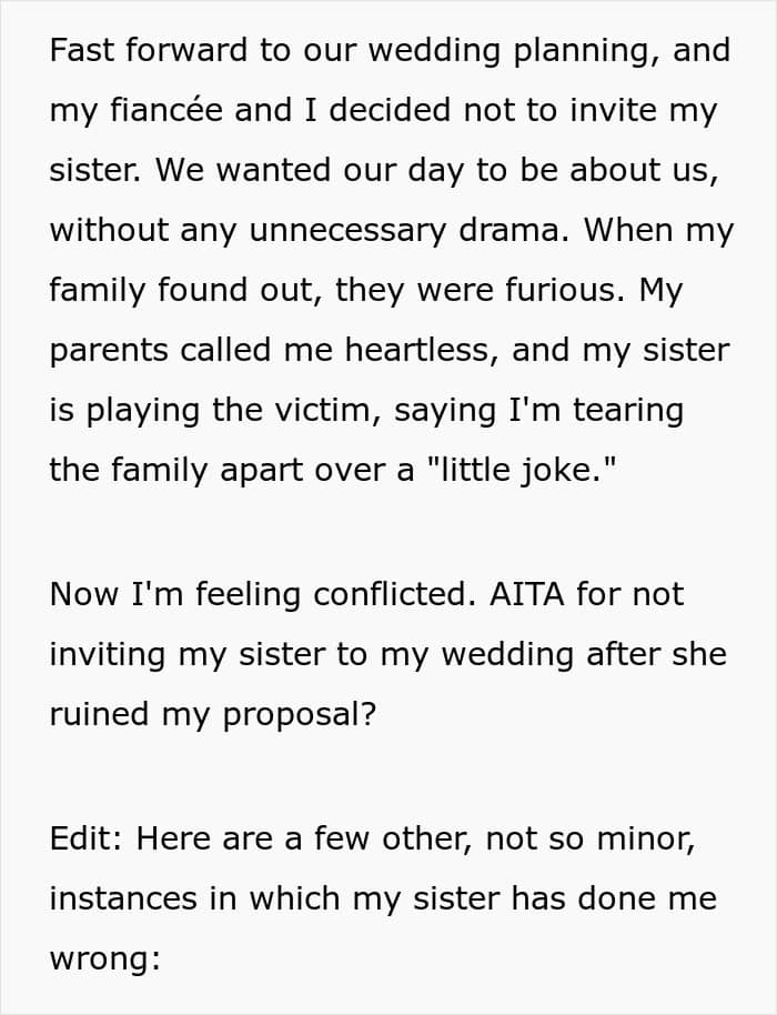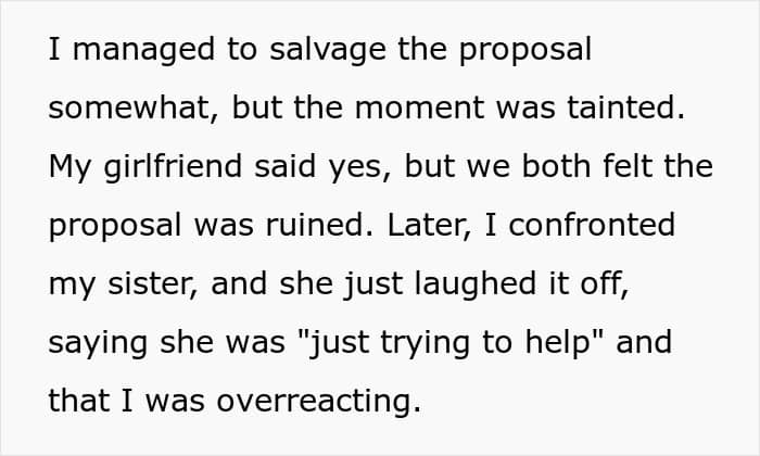 Just like Reddit userdirimndz who had a history of his sister just messing things up for him. But one day, she took things too far by ruining the perfect proposal that he had planned for his girlfriend, and the shocked couple decided to not invite her to their wedding.