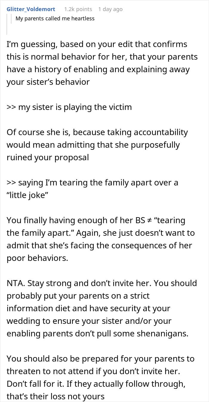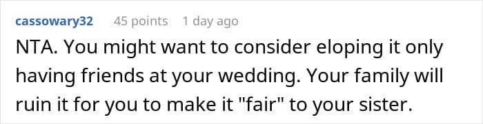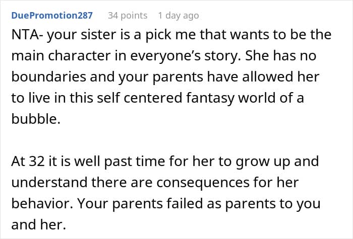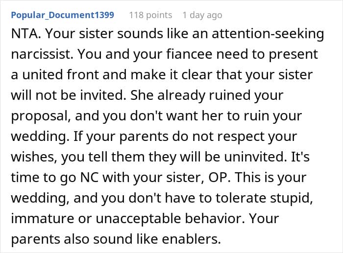 Her attention-seeking tales were so outrageous that netizens couldn’t believe that a person could do something so awful to their own sibling. They backed him up stating that his parents’ enabling behavior had further worsened her attention-seeking traits. They also said that he had every right to not invite her to his wedding as he didn’t want any unnecessary drama.
